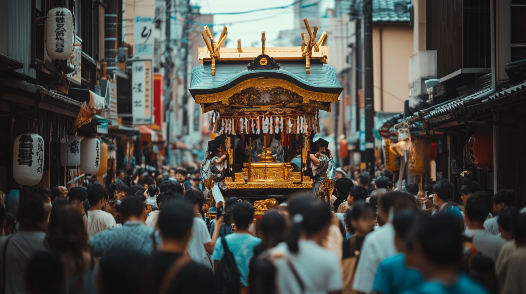 A "Mikoshi" is a sacred structure that plays an important role in traditional Japanese festivals. Typically, several to dozens of participants cooperate to carry the "Mikoshi" and parade through the town. This scene is an iconic landscape seen in many Japanese festivals.